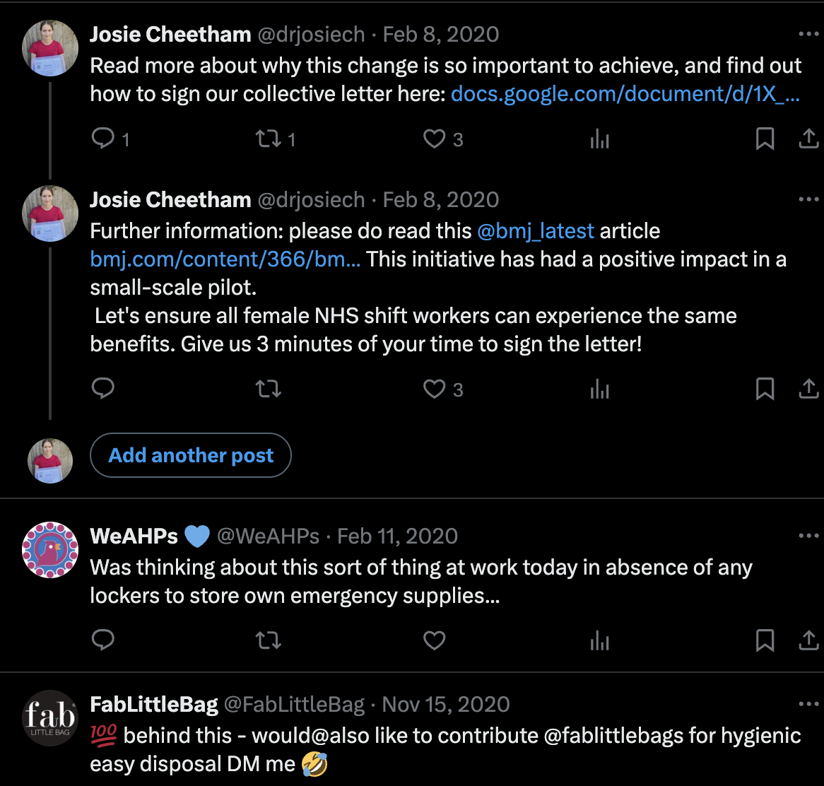 Some champions who have established their own SOS box-like period product provision initiatives are celebrated below, even if their social media accounts and thus identities have been deleted since. However, this is very definitely not an exhaustive list.